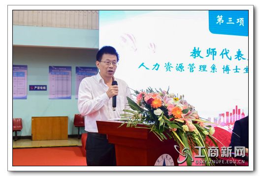 大会第三项,人力资源管理系导师、博士生导师韩翼教授作为教师代表发言。他首先引用王阳明“龙场悟道”等经典典故向同学们道出“人生需要磨砺”的道理,并结合自己的求学经历,围绕立功、立德、立言这几个方面,鼓励同学们学以广才,明志致远,以德为本,以善为本。最后,韩教授以一句英文典故“Stay hungry,Stay foolish(求知若饥,虚心若愚)”劝诫新生们在学习上求知若渴,在生活上谦逊待人。