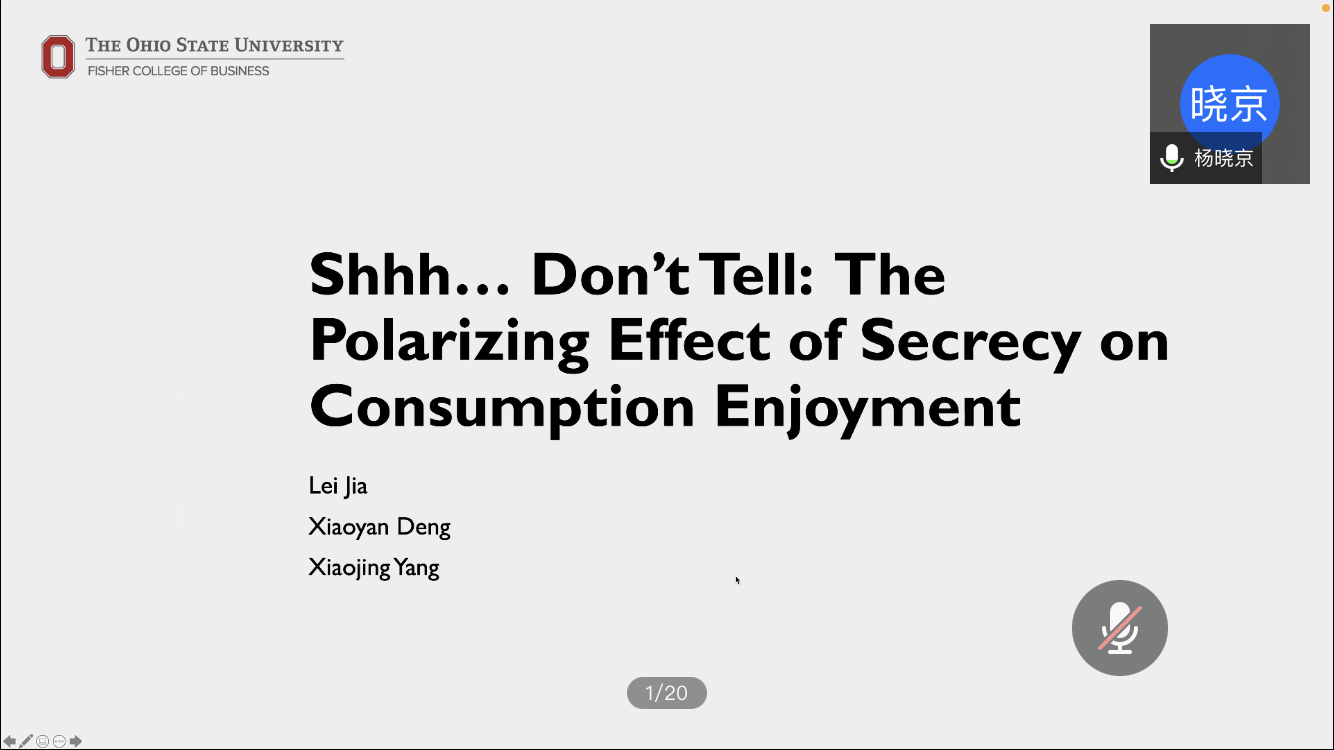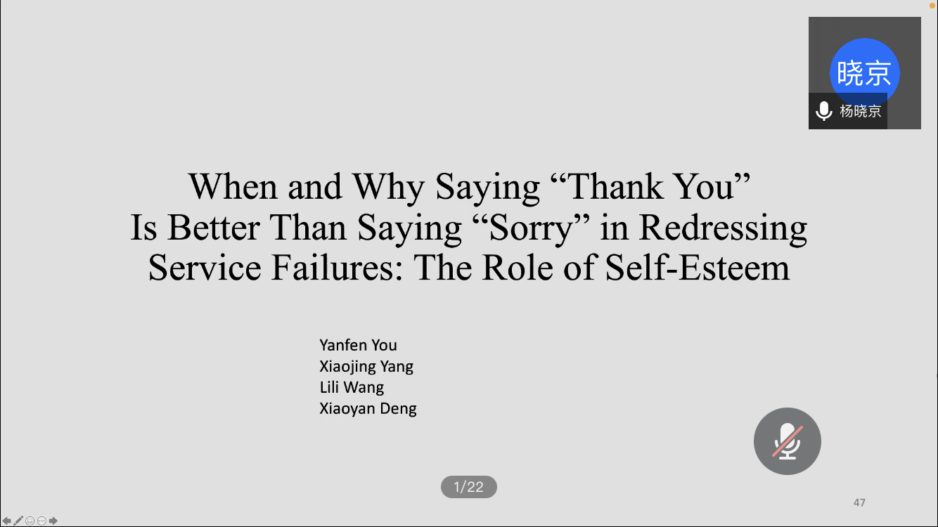 本次讲座杨教授首先回顾了上一期“视觉营销”的相关内容,随后围绕本期主题,分享了自己的有趣文章,分别为《Shhh…Don’t Tell: The Polarizing Effect of Secrecy on Consumption Enjoyment》和《When and Why Saying “Thank You” Is Better Than Saying “Sorry” in Redressing Service Failures: The Role of Self-Esteem》。除了对文章研究设计的细致讲述外,杨教授还热情分享了自己论文