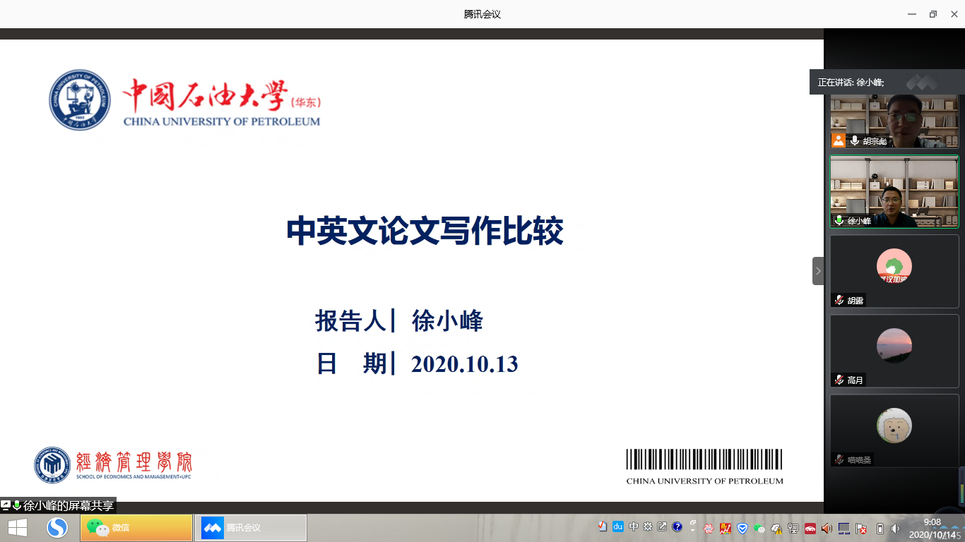 徐小峰老师首先介绍了《中国石油大学学报(社科版)》概况。其创刊于1984年,是由中华人民共和国教育部主管、中国石油大学主办的综合性人文社会科学学术期刊,重点关注能源经济、石油文化和有关黄河三角洲开发研究的理论热点。随后徐小峰老师根据其审稿经验,从引言、文献综述、模型方法和对策建议四个方面,根据中英文写作的特点,提出我们在中文和英文写作中需要关注的问题。对于中文写作,第一,撰稿人常会出现引言部分对所研究的问题描述不清,从而无法准确把握研究方向的问题。第二,文献综述更多是对前人研究内容的堆砌,与所研究内容的衔接不够清楚。第三,模型方法更多是对成熟方法的套用,理论假设未能很好地契合研究问题的特点。第四,对策建议过于笼统,缺少解决问题的针对性。相对英文论文,在引言部分更多要求突出核心问题,文献综述需要凸显与以往或当前研究的衔接与差异,对策建议鼓励从数值分析的全面性和专业性入手,强调对所研究领域的贡献与创新。徐小峰老师特别说明在进行实证分析之前,要先甄别研究问题的所属类别,根据研究问题的特点选择实证类型,并且注意排除预测研究、假设分析研究、假设检验研究中会影响研究结果的因素。如遗漏变量、发生一类和二类错误等问题,以确保评估决策的科学性和预测结果的合理性。另外,徐小峰老师在讲座中多次强调中英文写作的区别,引导同学们关注引言在论文中的重要性,并通过引入大数据技术对产业、区域的规划研究等事例,启发同学们对于新事物、新选题的思考。