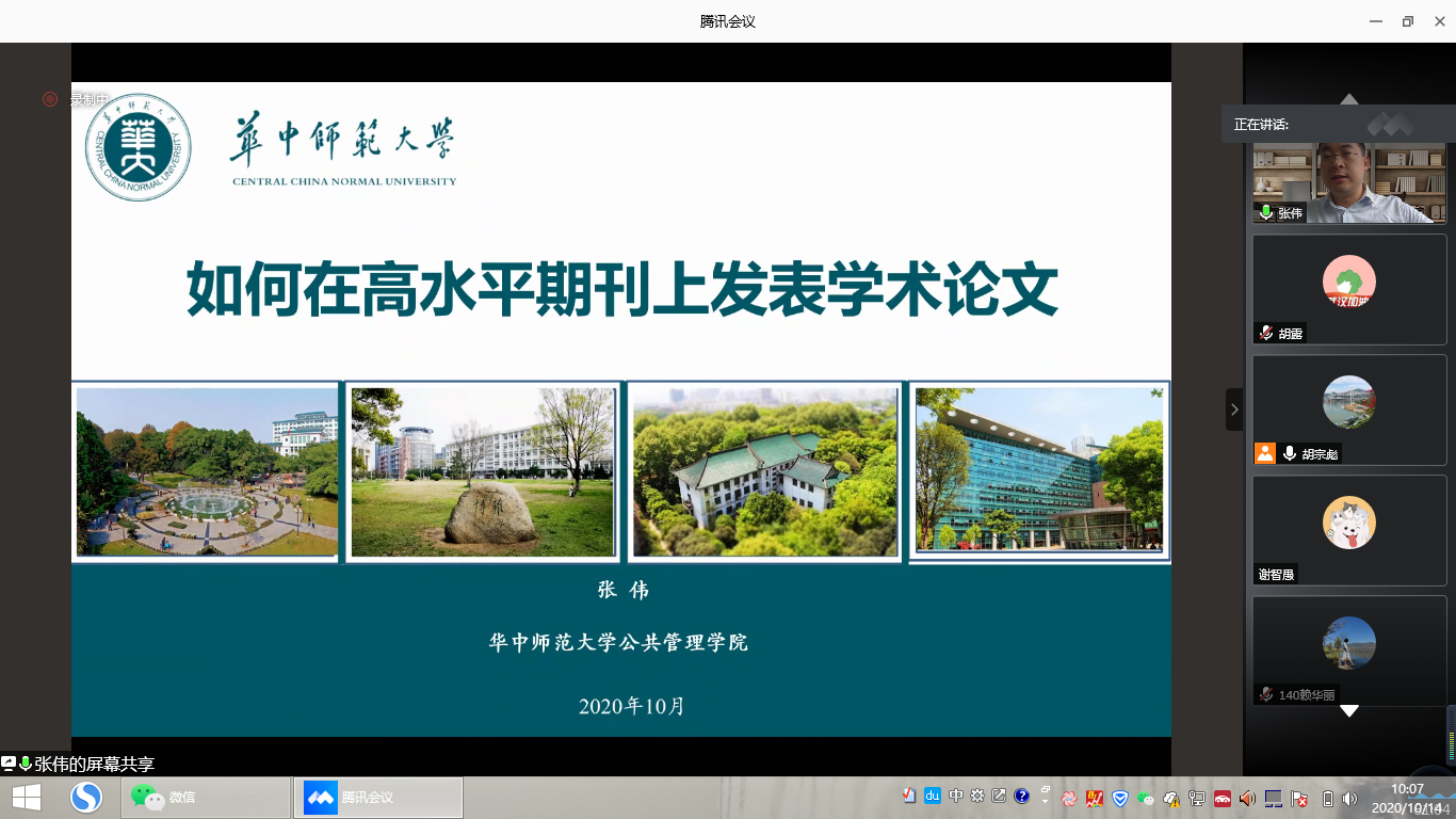 (通讯员 胡露)kaiyun官网中国经济贸易系于2020年10月14日上午9时,借助腾讯会议于线上成功举办关于“中英文论文写作比较”和“如何在高水平期刊上发表学术论文”的学术讲座。本次讲座分别由中国石油大学(华东)经济管理学院教授、博士生导师徐小峰老师和华中师范大学公共管理学院教授、硕士生导师张伟老师主讲,向同学们分享了他们在论文写作方面的经验与心得。讲座由胡宗彪副教授主持,我校kaiyun官网中国、经济学院以及清华大学等其他院校的硕士生、博士生共110多人参加本次学术讲座。