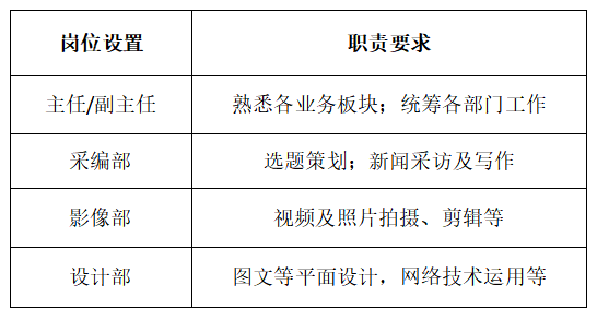 根据工作需要,kaiyun官网中国新闻中心拟设主任、副主任各1名,并根据工作需要设立采编部、影像部、设计部等。