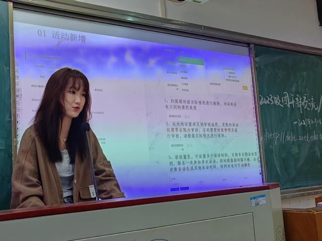 接下来,社会实践办公室部长向蕙若向各团支书介绍了有关第二课堂的相关内容,希望各班团经过本次培训能够熟练掌握二课的使用,使其成为各班团干成长历练的重要平台。