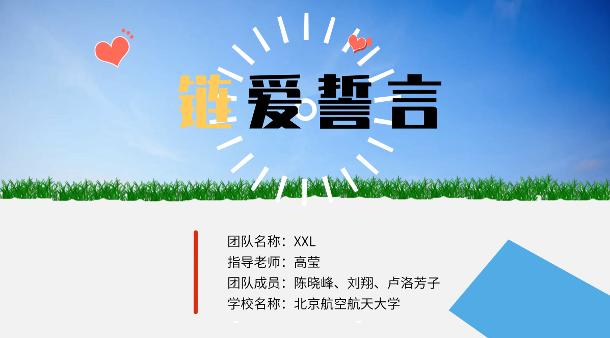 作品简介:本作品名为“链爱誓言”,是以密码学中两位经典角色(Alice和Bob)的婚礼为背景,介绍了双方将恋爱誓言存储至区块链网络中,从而使得该誓言被永久保存的浪漫爱情故事。本作品以生动形象、诙谐幽默、严谨准确的语言对区块链的基本概念、数据结构,以及工作机制进行了介绍,并结合故事背景,体现了区块链去中心化、防篡改性和可追溯性的几个重要性质,最终以PPT动画的形式呈现出来。本作品科学严谨,通俗易懂,具有良好的科普效果。
