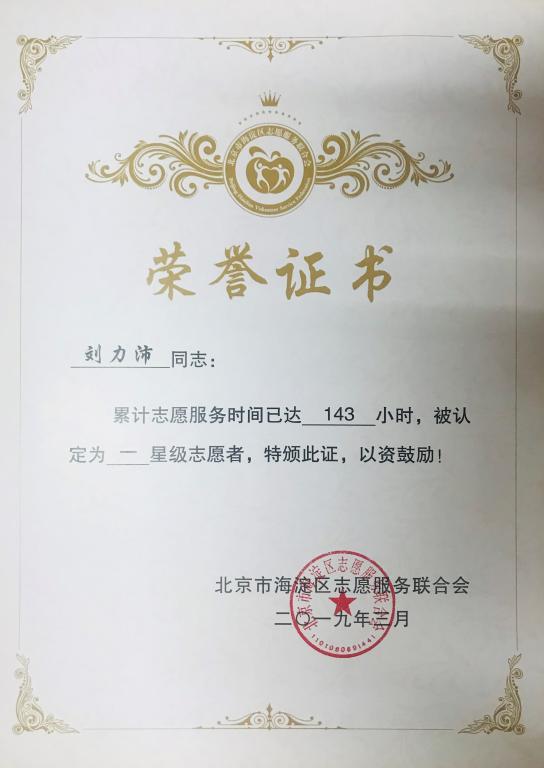按照 北京市海淀区志愿服务联合会《关于认定星级志愿者以及评选表彰2018年度海淀区明星志愿者、优秀志愿服务团队、优秀志愿服务项目的通知》的相关评比办法,经过单位推荐、材料核实、评委老师评审等程序,MILE米乐官网优秀学生刘力沛获“2018年度海淀区一星级志愿者”荣誉称号,予以表彰。