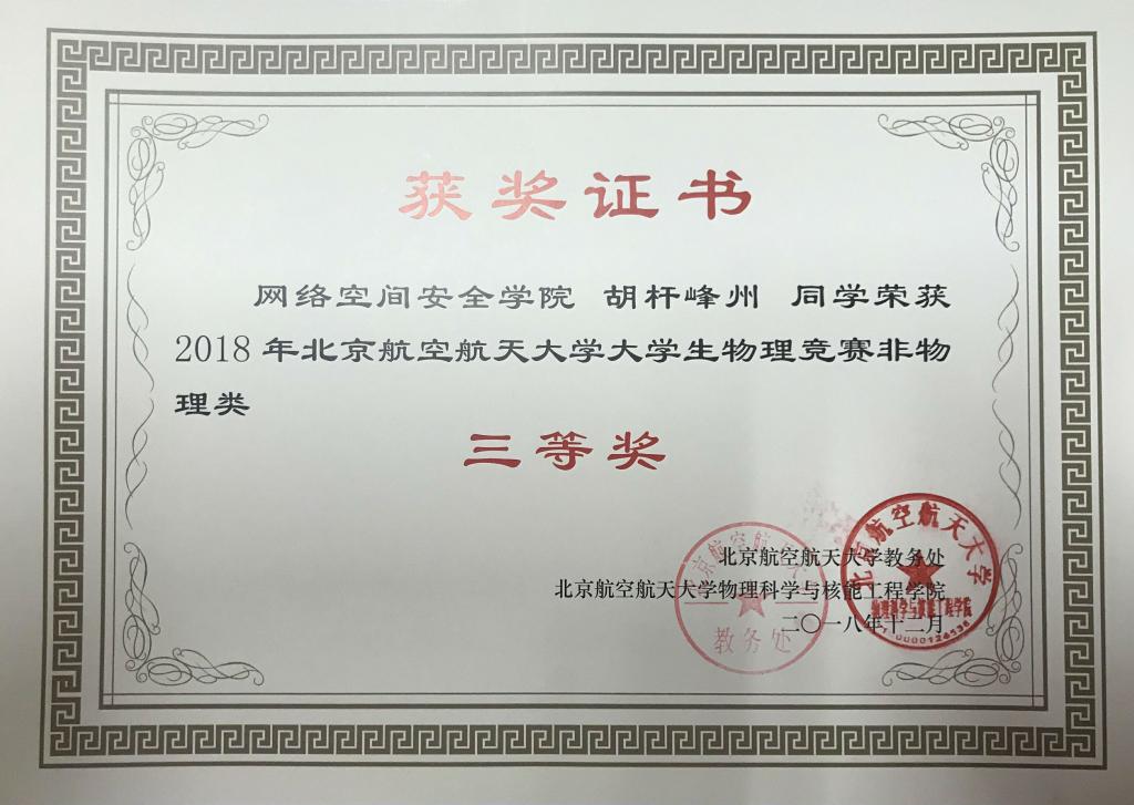 MILE米乐官网优秀学生胡杆峰州获“2018年MILE米乐中国官网大学生物理竞赛非物理类”三等奖,予以表彰。