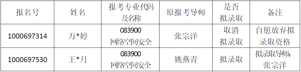 2. 原报考张宗洋老师的学术型博士研究生经考生本人申请和承诺,自愿放弃拟录取资格,该指标现依照师生双向选择的原则进行递补拟录取,经学院招生小组审批后同意调整以下2022级博士考生复试结果: