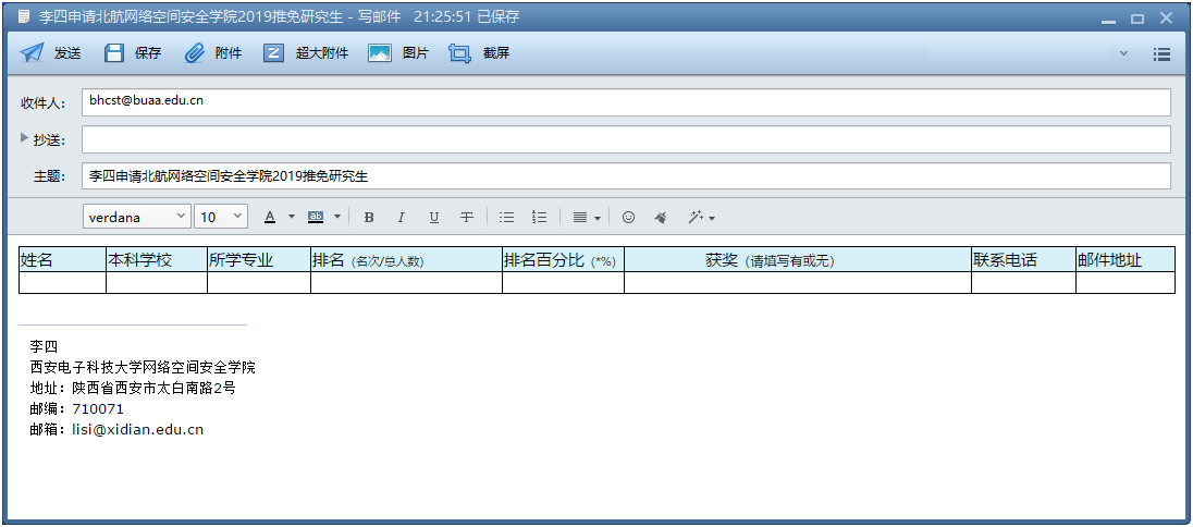 具体办法:4-10项材料制成电子扫描版,与2、3项电子版材料一起压缩,以附件形式发送邮箱:bhcst@buaa.edu.cn;第1项“报名表”填写好后直接“粘贴”到邮件内容页上,邮件主题命名为“×××申请北航MILE米乐中国官网2019推免研究生”。如图: