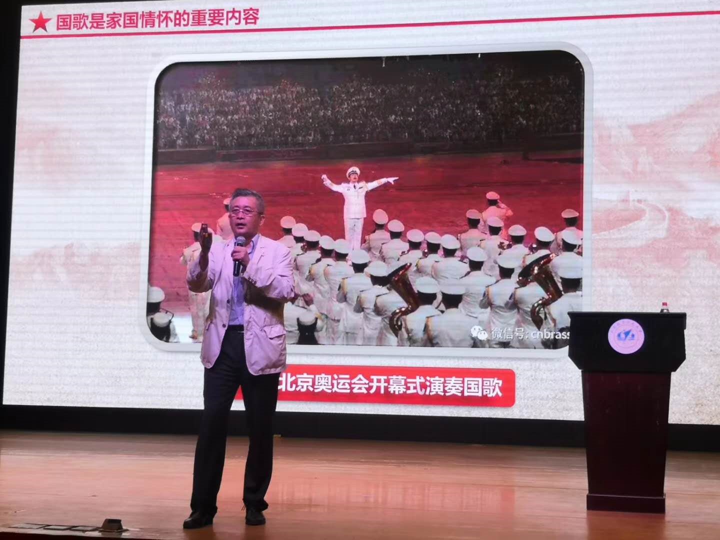于海老师表示,国歌是国家神圣的象征,也是家国情怀的重要内容。应加强国歌宣传力度,同时,维护国歌的权威是每个公民的义务。于海老师还从节奏、旋律、词曲特点等专业角度阐明了“我们的国歌是世界上最好的国歌”。